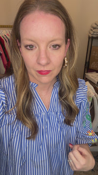 Bring a touch of charm to your wardrobe with this denim-striped embroidered top. Featuring delicate floral stitching and sweet ruffle details, this blouse blends comfort and femininity effortlessly. The frilled slit neckline and shirred yoke create a soft, flowy silhouette, it's perfect for brunch dates, casual outings, or adding a little country flair to your everyday look!