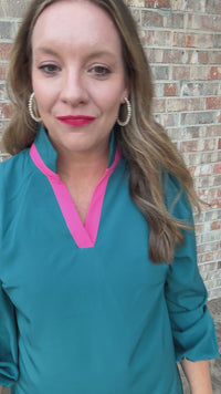 - High split neckline with pink contrast trim