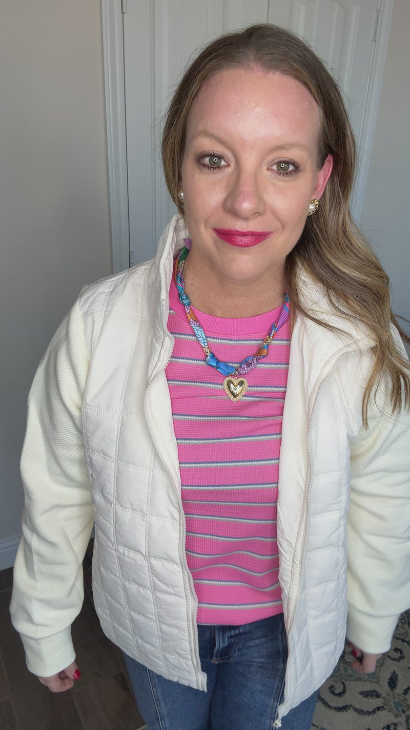 Stay warm and stylish in this ivory zip-down puffed jacket. Designed for those cozy mornings and breezy nights, it’s the perfect blend of chic and comfort! The soft puffed texture and side pockets make it both practical and adorable. It is your new go-to for layering or lounging. Pair it with jeans, leggings, or your favorite skirt for an instant cozy-cute look.